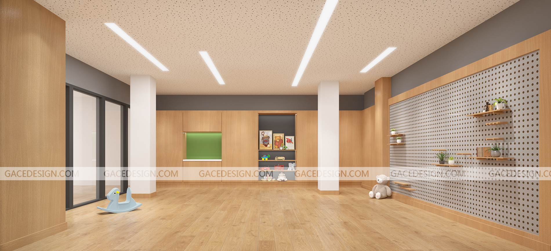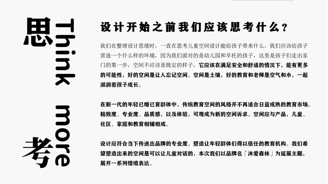 設計思考:在新一代的年輕群體中,傳統(tǒng)教育空間的風格并不再適合日益成熟的教育市場。精致度、專業(yè)度、品質感,以及體驗,可觀成為新的空間訴求。空間應與產品,兒童、社區(qū)、家庭和教育相輔相成。設計應符合當下傳遞出品牌的專業(yè)度。塑造讓年輕群體們得以信任的教育機構。我們希望塑造出來的空間是可以讓兒童對話的,本次我們以品牌名「沐愛森林」為延展主題,展開一系列情境表達。