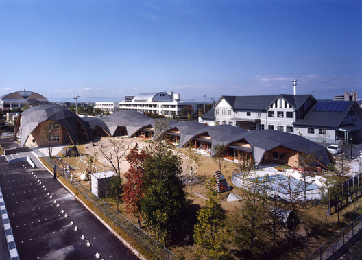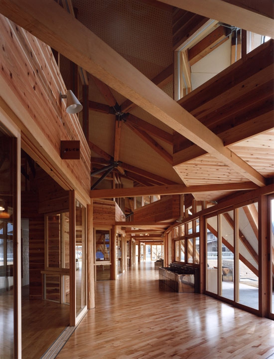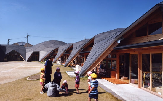 maihara幼兒園它位于日本滋賀縣,它的周邊都是一些新建的住宅區(qū)。混凝土的盒子由連續(xù)的木頭屋頂鏈接為一體,屋頂用連續(xù)的三角形的平面構(gòu)成;它的結(jié)構(gòu)的強度和形狀的連續(xù)性有很大的自由度。屋頂使用2.5米長的木梁和六角形的金屬(接頭)配件,工廠預(yù)制,現(xiàn)場裝配。木制桁架和混凝土盒子組合出各種各樣的結(jié)構(gòu)表現(xiàn)效果。