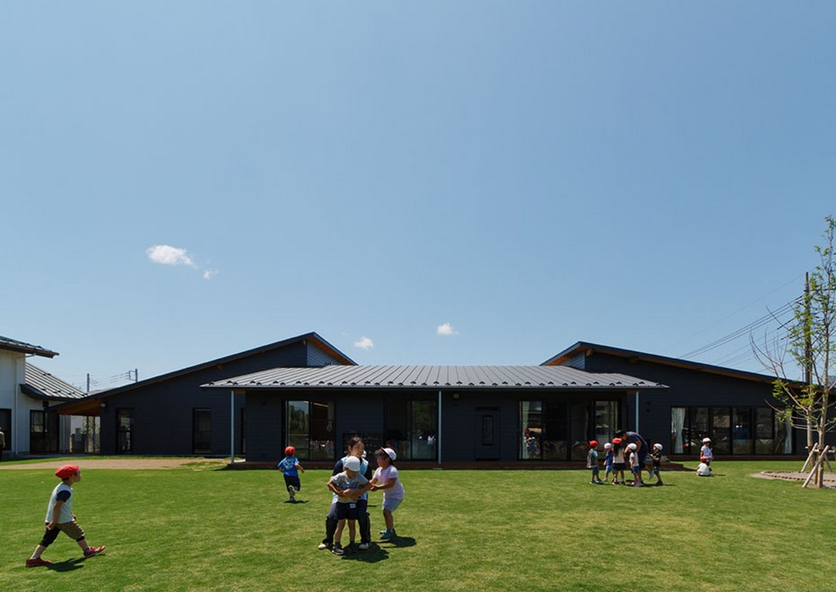 連接建筑物所產(chǎn)生的空間被用作庭院和按不同年齡段分類的花園。計劃中庭院的大小存在適當(dāng)?shù)木嚯x,使孩子們可以看到同一水平的風(fēng)景。在兒童衛(wèi)生間,面對庭院的圖畫書室、餐廳和嬰兒室,可以建立他們在生活中自然地看到彼此的關(guān)系。