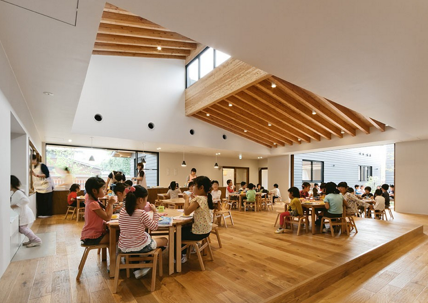 屋頂相互連接,并按照方向和功能劃分等級。它通過產(chǎn)生不同高度的天花板提供了上下不一的內(nèi)部空間,并吸引孩子們的好奇心。值得注意的是餐廳。在餐廳,舒適的風(fēng)從與屋頂連接的高側(cè)窗吹過,產(chǎn)生一個舒適、明亮的空間。