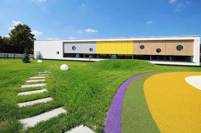 在波蘭的Yellow Elephant幼兒園坐落在一片綠色的草坪上,有著五間房間能夠容下一百三十多名孩子卻只有一層的幼兒園,由白、黃、綠、紫的顏色構(gòu)成的場(chǎng)地為孩子們提供了游戲場(chǎng)所。在藍(lán)天綠地的映襯下,這家幼兒園宛若一片置身于童話世界中的兒童樂園。