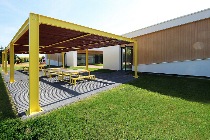 幼兒園前面的庭院設(shè)置有采沙坑和樹木,在建筑物的心臟。建筑前面有一處涼亭,涼亭里面有小桌子和凳子,都是用黃色顏料粉刷的,是供孩子們下課時(shí)享受日光浴的好去處。建筑中廳向著中庭開放,大大的窗子允許自然光最大程度地通過。儲(chǔ)物室和教室直接連通。儲(chǔ)物室的窗子可以滑開,方便了孩子們選擇最短的途徑奔向花園玩耍。有著低矮屋頂?shù)挠悦孀呃仁峭ピ旱耐ǖ溃呃鹊牟AТ澳:死锩婧屯饷娴倪吔纭#?/span>幼兒園室內(nèi)設(shè)計(jì))