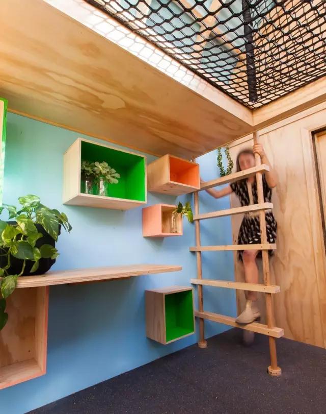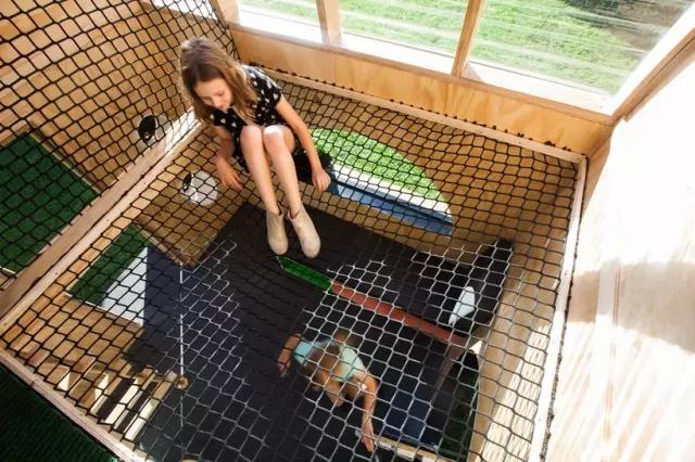小木屋的頂部使用的是彎曲透明的屋頂,可以使得陽(yáng)光能夠直接的照射到室內(nèi),還有就是屋內(nèi)設(shè)置了一個(gè)很有趣味性的功能網(wǎng),通過(guò)室內(nèi)的小木梯可以上到屋頂下的掛網(wǎng)上玩耍是一個(gè)非常不錯(cuò)的體驗(yàn)。