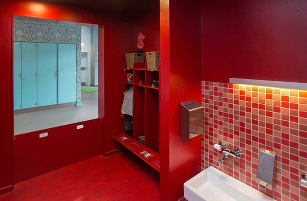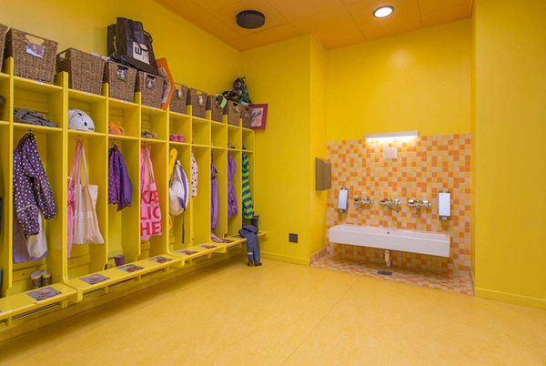 其幼兒園室內(nèi)設(shè)計(jì)“宛如一個(gè)珠寶盒”:在整個(gè)幼兒園的內(nèi)部都是繽紛的色彩、復(fù)雜的圖案和不同的肌理愉悅了孩子們的身心。同時(shí)裝飾有色彩、圖案豐富的壁紙和瓷磚。建筑如同一個(gè)大型的珠寶盒,這能夠喚醒孩子的好奇心,培養(yǎng)孩子們的探索精神,而且還為孩子們創(chuàng)造出五彩的內(nèi)部空間和趣味十足的游樂(lè)場(chǎng)供孩子們玩耍嬉戲,有趣的活動(dòng)空間設(shè)計(jì)讓孩子們的由著足夠是運(yùn)動(dòng)量。雖然平面布置十分復(fù)雜好似迷宮,但不同的色彩便于人們辨別方向。