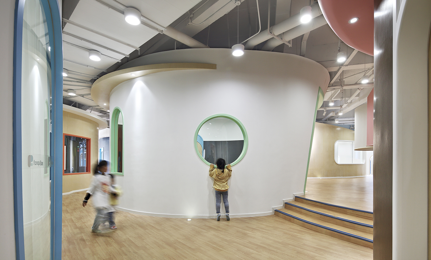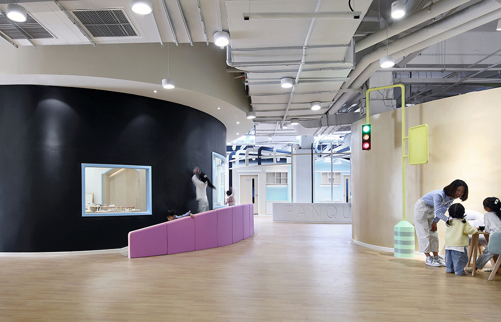 設計師將這些單個場所及其代表性元素,一一落實到番趣兒童成長中心后,不僅形成了有趣的分區和大量多元化的小角落,還驚喜地產生了很多趣味性的視覺呈現。室內的承重柱也不知不覺被設計師巧妙隱藏了起來。