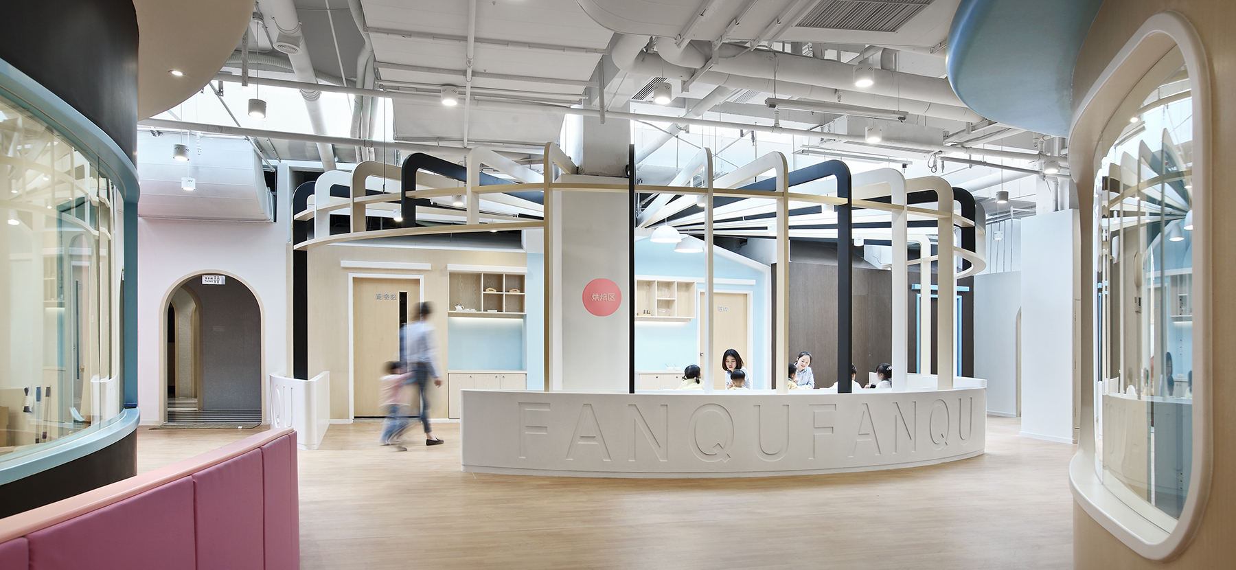設計師延伸“番趣”的品牌形象,打造項目主入口外觀,品牌元素與園區的展示需求相融合,構成明凈活潑的外觀形象。門頭和前臺造型取自品牌“F”元素,以親切的姿勢歡迎小朋友和家長的到來。