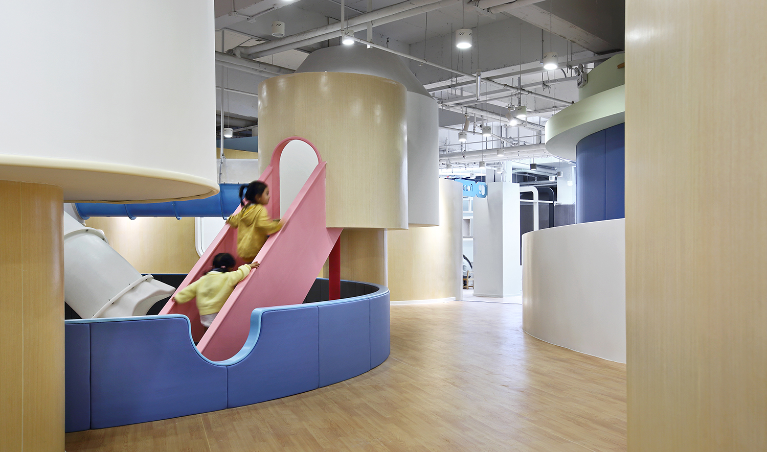 游戲是孩子的活力之源,也是孩子通往世界的途徑。設計師將游樂區布局在室內的中心位置,讓孩子的歡聲笑語激活整座“城”。孩子們會帶著好奇和期待爬上梯子,穿過可愛的小木屋,在管道中匍匐前進,然后“咻”地一下滑入下沉的球池,在不斷變化動作和愉悅的體驗中獲得身心的鍛煉和能力的發展。