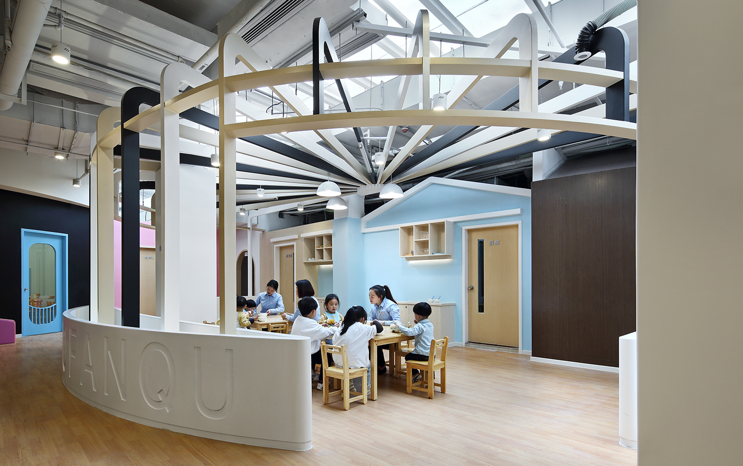 設計師將室內采光最充足的區域留給餐廳、繪本區等公共區域,同時打造開放感,以此盡量延展陽光在成長中心的照射范圍。當陽光進來,仿佛天燈將整座城市點亮。孩子們能夠在陽光下活動,吃飯、讀書、玩樂,隨著時間的變化觀察光影,感受陰晴雨雪和四季變化。
