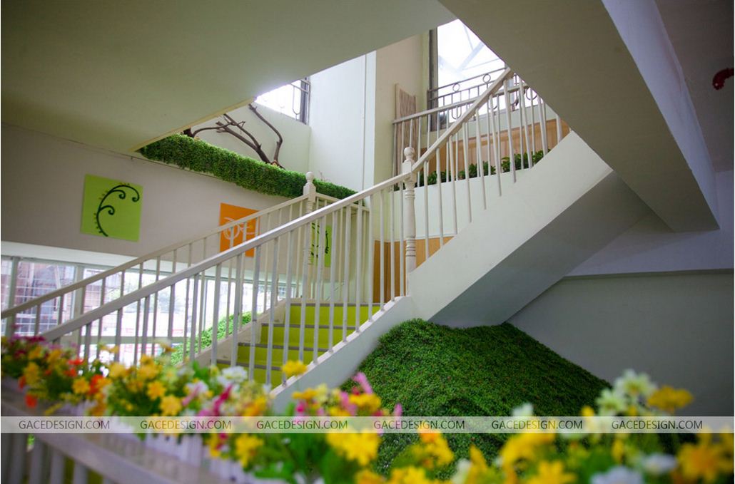 利用裝修,克服原有建筑的事故隱患,保障幼兒安全,是幼兒園裝修中特別要注意的一點(diǎn)。樓梯方面,幼兒翻越樓梯扶手或把扶手當(dāng)成滑梯玩時(shí),都有可能發(fā)生傷害事故。為避免事故發(fā)生,幼兒園一般采用掛網(wǎng)處理,手段比較單一,也欠美觀。在樓梯所形成的空間底部,用質(zhì)地較軟的杉木裝修成波波球池,樓梯的水泥側(cè)面也用杉木板包邊。萬(wàn)一幼兒翻越欄桿,身體碰撞在軟處理過(guò)的欄桿上,可無(wú)大礙,掉在波波球池里,也是軟著落,有驚無(wú)險(xiǎn)。