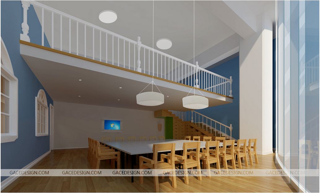 幼兒園的教室、通道及其他活動(dòng)空間是建筑師依據(jù)相應(yīng)的活動(dòng)流量、人體工效學(xué)和建筑標(biāo)準(zhǔn)設(shè)計(jì)的,而繁多的家具、教具和玩具設(shè)施,往往與有限的空間產(chǎn)生沖突。保證兒童有寬敞的活動(dòng)場(chǎng)地是幼兒園裝修要考慮的重點(diǎn)之一。在裝修設(shè)計(jì)時(shí)充分注意到這點(diǎn),利用建筑物的墻角與門(mén)后形成的零碎空間,設(shè)計(jì)制作儲(chǔ)物柜、櫥、小擱架等,把大空間留出來(lái),不僅使幼兒活動(dòng)空間寬敞、安全,也形成一種視覺(jué)上的完整、流暢和通透。小班活動(dòng)室中搭建的小閣樓正是基于這一思想設(shè)計(jì)的。閣樓上下形成兩個(gè)相對(duì)獨(dú)立的活動(dòng)空間,使教室的活動(dòng)空間增加了近三分之一。